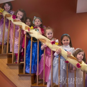 On the day of the party, all of the guests were encouraged to wear their favorite princess attire. As they made their entrance, the little girls oohed and aah-ed over each other’s fancy party wear and then commenced to following the long braid of yellow tulle “hair” adorning the banister to see if Rapunzel was up in Lo’s room